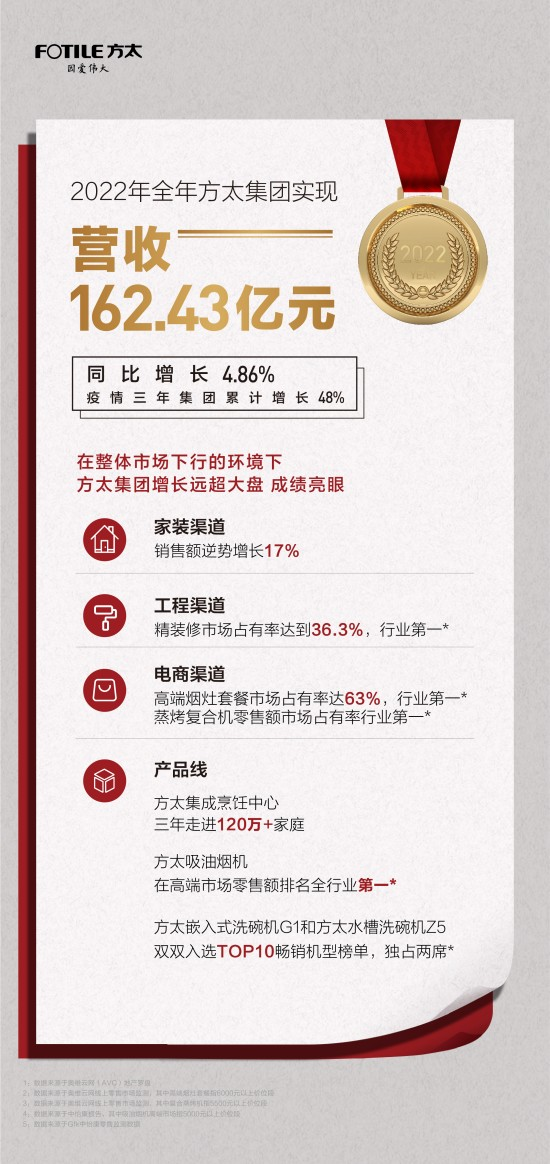 在新年致辞上,茅忠群表示,2022年是挑战巨大的一年。国内经济继续面临需求收缩、供给冲击、预期转弱三重压力。新冠疫情的挑战前所未有,国内房地产业危机加剧。行业方面,2022年整体厨电行业呈现较大的负增长。在全体方太人的共同努力下,2022年集团销售收入实现162.43亿,同比增长4.86%,疫情三年集团累计增长48%。2022年公司还获得全国五一劳动奖状,浙江省创造力百强企业第三名,中国民营企业发明专利授权量十强等佳绩。借此机会,我谨代表方太集团,向所有方太人、所有合作伙伴、2000余万方太用户、关心支持方太的各级领导、所有家人和朋友们致以最衷心的感谢和最诚挚的祝福!