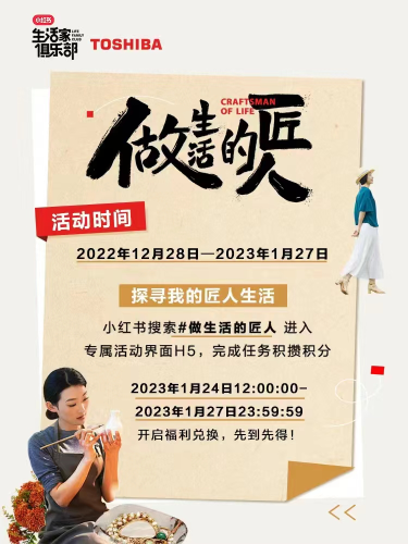 为了让更多人了解和体验匠人生活,小红书和东芝还准备了东芝水波炉VD7000、东芝T16小书包波轮洗衣机、精控鲜旋风空气炸锅等匠心福利好礼。2023年1月27日前,在小红书站内搜索话题#做生活的匠人进入活动H5页面,完成任务,获取积分,即有机会参与1月24日12点至1月27日24点的好礼兑换。