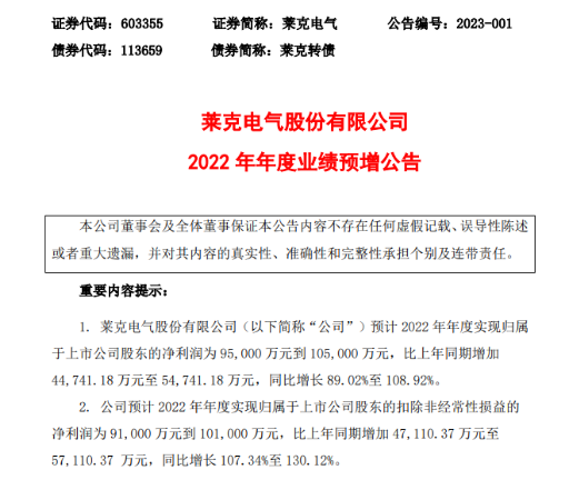 同时,莱克电气预计2022年年度实现归属于上市公司股东的扣除非经常性损益的净利润为91,000万元到101,000万元,与上年同期相比,将增加47,110.37万元至57,110.37万元,同比增长107.34%至130.12%。
