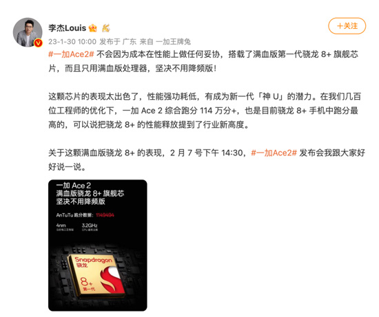 一加Ace 2将为用户带来同档位产品中前所未见的极致体验。性能上,一加Ace 2搭载满血版骁龙8+移动平台,安兔兔跑分高达1149494分,刷新骁龙8+移动平台最高纪录。李杰提到“一加不会因为成本在性能上做任何妥协,Ace系列只用满血版,坚决不用降频版!”