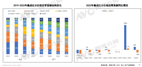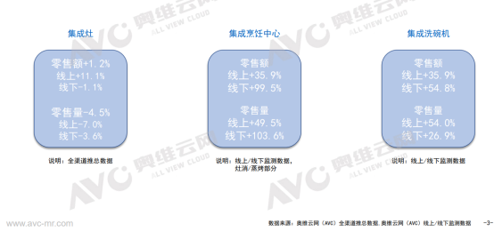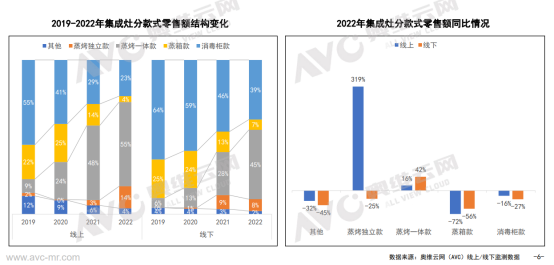 据奥维云网(AVC)推总数据显示,2022年集成灶市场零售额259亿元,同比增长1.2%,但零售量同比下滑4.5%;集成烹饪中心-灶消/蒸烤线上市场零售量、零售额分别同比增长49.5%、35.9%,线下市场零售量、零售额分别同比增长103.6%、99.5%;集成洗碗机线上市场零售量、零售额分别同比增长54.0%、35.9%,线下市场零售量、零售额分别同比增长26.9%、54.8%。