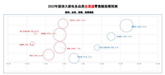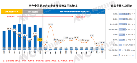 其实,从销售规模来看,集成灶已经超过了大多数厨卫品类。奥维云网(AVC)数据显示,2022年集成灶的市场规模为259亿元,这一规模超过了燃气灶,仅次于油烟机(市场规模为296亿元)。