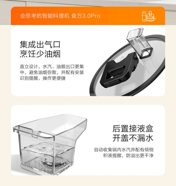 添可食万3.0 Pro采用清洁电能,不仅比传统炉灶能节省约39%的热效率,并且通过采用IH立体控火技术并配合特制悬浮式升降双翼搅拌铲,9档温度智能调节,可满足不同食材、烹饪方式,菜肴均匀受热,锁住鲜香营养。加之锅盖上方专门设计了直立式集成出气口以及后置接液盒,能够有效汇聚和收集烹饪中产生的水汽、油烟,避免传统厨房中的烟熏火燎,尤其是夏天,这一优势将更加明显,真正体现了科技以人为本。