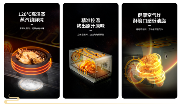 各式的食材经过各种温度与烹饪方式,就会变为各式美味佳肴。经过120℃高温蒸汽的熏陶,便能炖出锁鲜营养鸡汤;或是经过3D循环炙烤,香喷喷的烤鸡鲜嫩出炉;更能经过风扇“空气炸”,享受酥脆少油的鸡米花。美食的温度,由亿田D6ZK蒸烤炸集成灶传递!