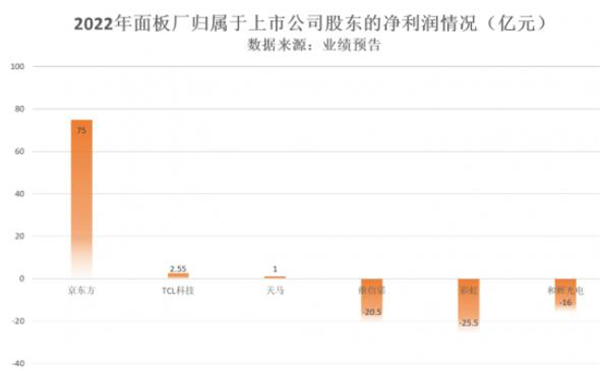 根据相关预测数据显示,京东方预计2022年归属于上市公司股东的净利润为75亿元到77亿元,同比下降70%到71%。TCL科技归属于上市公司股东的净利润为2.55亿元到3.58亿元,同比下降96%到97%。天马微电子归属于上市公司股东的净利润为1亿元到1.3亿元之间。
