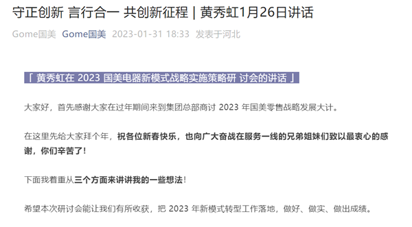 1月31日,Gome国美公众号刊发了董事长黄秀虹的讲话全文,题为《守正创新言行合一共创新征程》。