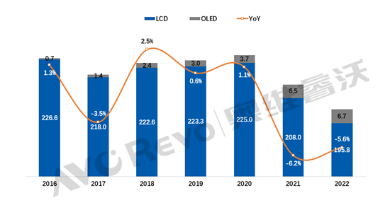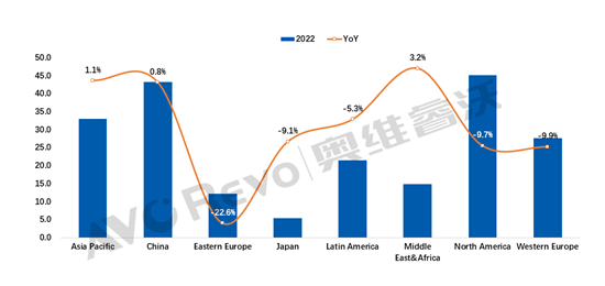俄乌战争导致经济疲软与高通胀,欧洲TV需求大幅下滑,2022年欧洲TV出货规模下降14.2%,其中东欧下降22.6%,西欧下降9.9%。随着俄乌战争的持续,2023年欧洲市场TV需求预计维持低迷。