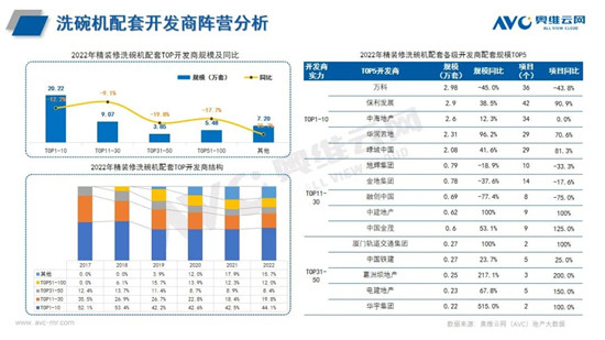 从开发商阵营分析,近几年随着头部房企暴雷,开发商竞争角逐导致排名变化较大,保利发展从去年第四位荣升第一位,厨电精装房新开盘规模22.14万套,万科仍然坚守第二位,厨电精装房新开盘规模20.35万套,2家头部房企以绝对优势领跑全国。其中华润置地、建发地产、越秀地产、滨江集团等增速较快,与去年同比分别上升21.4、19.477.0、75.4个百分比。