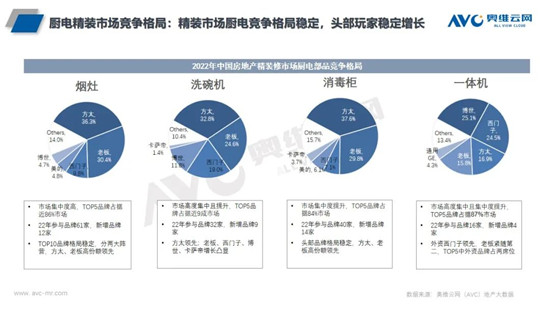 奥维云网(AVC)《2022年中国房地产商品住宅精装修市场厨电年报》总结精装修市场厨电产品呈现以下特征:
