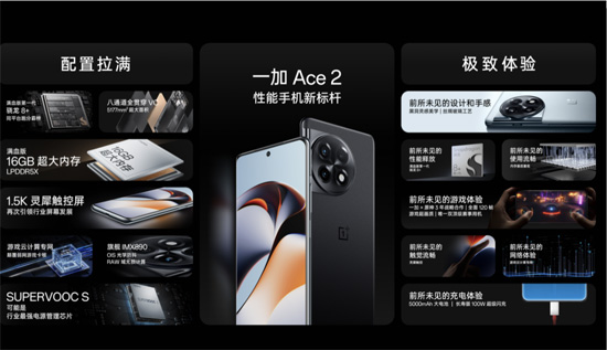 一加Ace 2还搭载了多项独家自研“黑科技”,为用户带来同价位段前所未见的极致体验。一加Ace 2全球首发搭载SUPERVOOC S全链路电源管理芯片,搭配长寿版100W超级闪充系统以及5000mAh大电池,25分钟即可从1%充到100%,为用户带来了全新充放电体验;一加Ace 2全球首发1.5K灵犀触控屏,搭载了独家自研的灵犀触控技术,实现了对手机触控系统的全链路优化,全面提升触控跟手性、精准度和稳定性,树立“触控新标杆”;一加Ace 2采用旗舰同款IMX890主摄和自研RAW域无损计算技术,打破性能手机影像功能弱的固有印象,让用户真正享受到旗舰级体验。