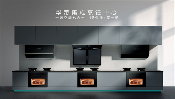 此次发布会上,华帝聚焦集成厨电解决方案所打造的集成烹饪中心正式亮相,清晰呈现产品主打的“一米空间七合一15分钟4菜1汤”核心亮点。