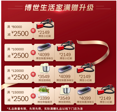 除多款优质家电产品以外,“博世生活家,开年狂享季”大促活动更为消费者准备了多重狂享好礼:2月10日至3月20日,消费者于指定渠道购买博世家电产品可享受大额满减优惠,单笔订单最高可减2500元;大额订单还可享受“小家电满赠”活动,涵盖博世小红刷、除菌净味仪、厨师机、智能室内种植机等多款产品。