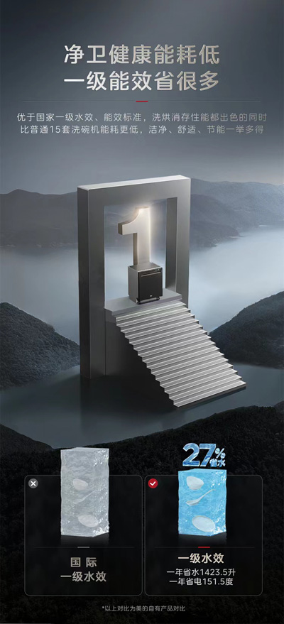 绿色节能方面,美的自研五臂飓风洗技术,配合创新型双驱变频电机技术,强力冲刷餐具顽固油污,锅具洗净率提升60%,特别加入滤网自清洁系统,排水时旋涡带动滤网自转,强力冲甩残渣,无须额外手动清洗。采用国家一级水效标准,依托大容量节水节能高效集成底座布局技术,一年省水1423.5升,相当于每年节省约2847瓶纯净水。为进一步降低水资源的消耗,支持上下分层洗,分区域启动喷臂,满足用户少量碗碟一餐一洗的习惯,节能省钱的同时也更为方便。