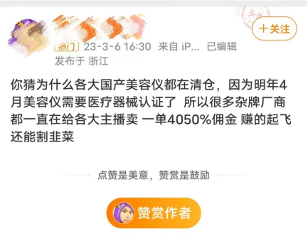 但同时,互联网上有美妆博主揭秘:这是美容仪在清仓!因为“因为明年4月美容仪需要医疗器械认证了,所以很多杂牌厂商都一直在给各大主播卖一单40-50%佣金,赚得起飞还能割韭菜。”