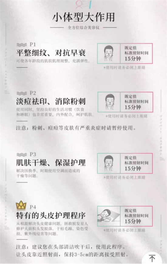 比如对于“大排灯”比较普遍的说法是:越大越有效,因此最小规格的“小排灯”面板也有24*11,“小排灯”商品页面上,所有功能的光照时间均为15分钟。“大排灯”光照时长最短是肌肤弹力模式为5分钟,这与越大越有效的说法呼应。但目前同样有红蓝光的宙斯二代的接触面相比而言极小,并且完全不可能实现同一个位置光照5分钟。