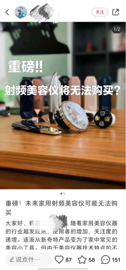 对此,小红书上有网友表示:还好今年没买,明年就可以买达到标准的产品了。但是同时也有一些比较有煽动性的内容“未来家用射频美容仪可能将无法购买”,不得不说,“命悬一线”的部分射频产品可能真的急了。