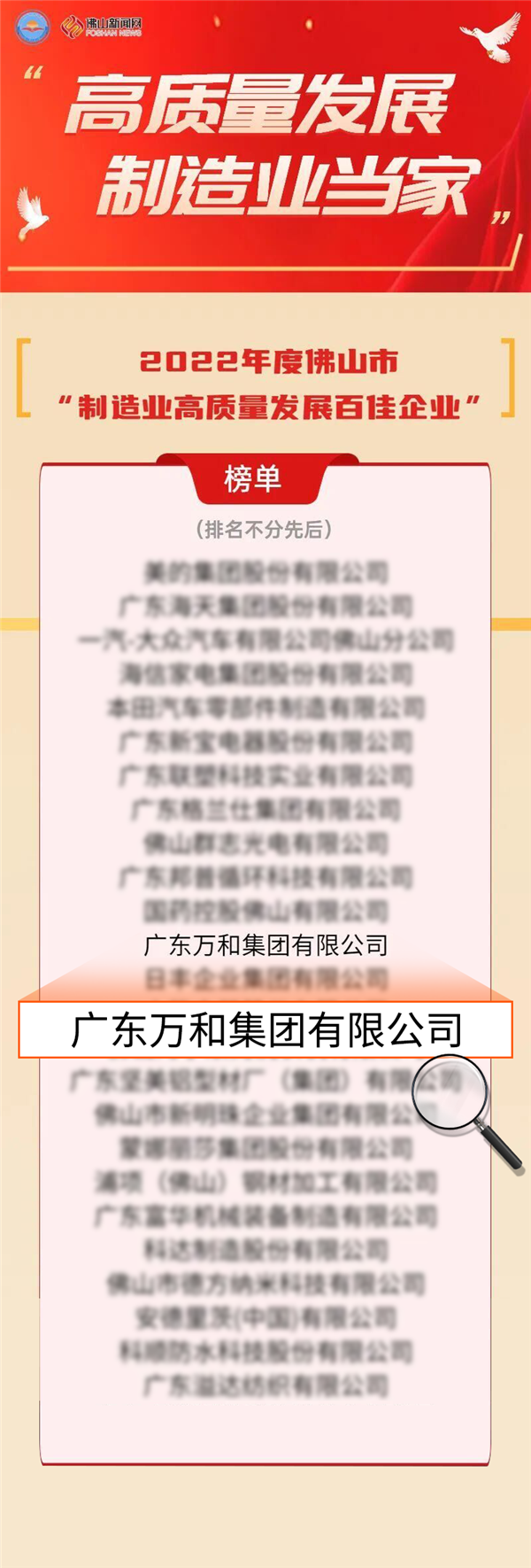 目前,万和集团控股三大实业板块:万和电气(股票代码:002543)、广东鸿特精密技术股份有限公司、广东南方中宝电缆有限公司,直接或通过子公司参股佛山市科技小额贷款有限公司、嘉合基金管理有限公司、广东顺德农村商业银行股份有限公司、广东揭东农村商业银行股份有限公司等企业。万和集团是广东省“2020-2021年度省重点支持大型骨干企业”,连续多年上榜“广东省百强民营企业”,连续六年上榜“中国制造业民营企业500强”。