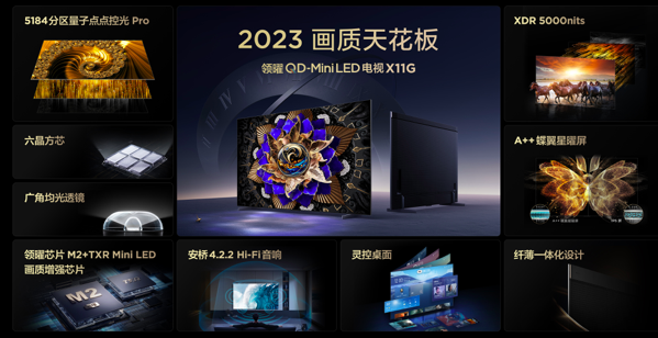 作为年度旗舰产品,TCL X11G是全球第一台XDR 5000nits峰值亮度、5184分区量子点点控光Pro的“双5000”标准QD-Mini LED电视,拥有5000万:1的超高对比度,融合A++蝶翼星曜屏、4.2.2 Hi-Fi音响、领曜芯片M2+TXR Mini LED画质增强芯片、灵控桌面UI和纤薄一体化设计等配置,造就2023画质天花板。