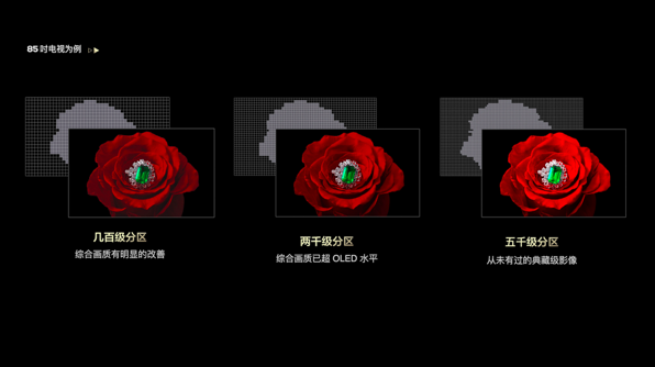 此次推出的TCL X11G,实现了行业最高的5184背光分区。电视分区越多,越能够精细地控制背光区域的明灭,从而使得画面明暗层次更加分明,带来更优异的画质体验。目前,行业轻旗舰级电视处于数百级背光分区级别,而分区数达到2000级,综合画质已经超越了OLED的水平。TCL X11G分区数量前所未有的达到5000+级,以点光源代替面光源,画面更通透,同时细节拉满,足以定义典藏级的影像水准。