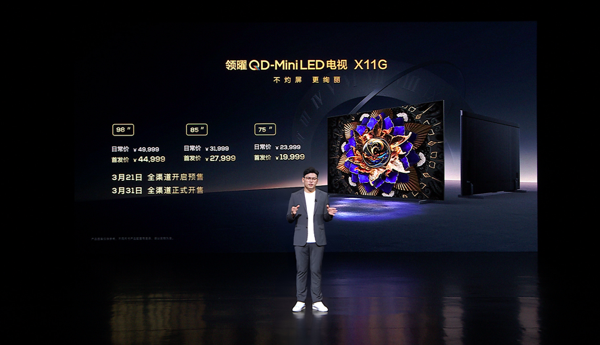 TCL领曜QD-Mini LED X11G于3月21日开启全网预售,3月31日正式开售。共有98吋、85吋和75吋三个尺寸:98吋新品首发价44999元,85吋新品首发价27999元,75吋新品首发价19999元。