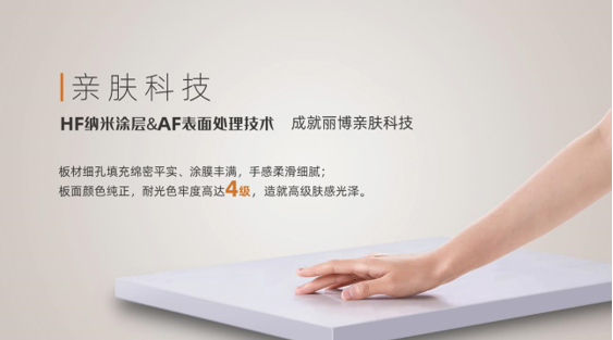 丽博丽肤板融合HF纳米准分子科技与业界领先的纳米涂层技术,从触感、视觉、质感及环保性等多维度,合力为人们打造具有亲和力的家居空间。