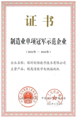 多年来,集团旗下的创维数字海外业务实现了本地化人员配置、供应链、生产制造、测试品控、销售供应、售后服务的全流程标准化,成为全球行业内拥有最完善解决方案的主流系统集成供应商之一,公司因此荣获国家工业和信息化部、中国工业经济联合会颁发的“制造业单项冠军示范企业”称号。