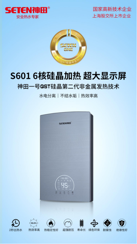 神田在即热式电热水器品类中拥有专利技术——神田一号QST硅晶第二代非金属发热技术。