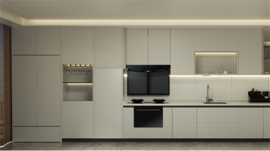 在外形上,烟机上排集成的设计打破了千篇一律的厨房形态,充分利用地柜空间,分模块集成,以及与各式橱柜的完美融合,让厨房从视觉上提高了整体格调。此外,华帝集成烹饪中心整机外观以黑色为主,晨曦金颜色元素为机体外观增添了时尚质感,一体式大玻璃面板搭配纤细精致金属把手,呈现出整体性的简约、高级。