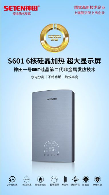 作为一款高端配置定位的产品,S601采用了硅晶6核加热,水电分离,不结水垢,具备防漏电、防超温、防超压、防干烧、故障自检多种安全保护,也应用了智能变频恒温、断电记忆、半小时无操作自动待机等人性化功能。