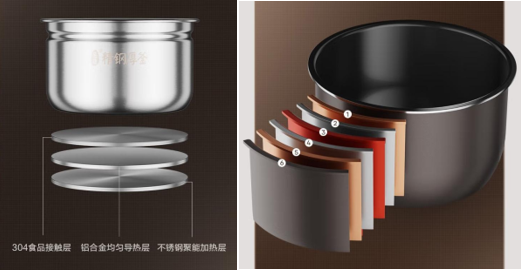 美的速嫩感电压力锅配备了一只精钢厚釜内胆和一只玄钢厚釜内胆,专胆专用可满足用户烹制花样食物的需要。其中精钢厚釜采用SUS304食品级材质,底部2.7mm三层复合,耐刮花并且受热更均匀,十分适合用来制作各种肉类或炖汤;玄钢厚釜内胆底部三层复合厚度3.9mm,更高的厚度带来更优良的传热性能,煮饭喷香Q弹不粘锅,使用过后非常方便清洗。