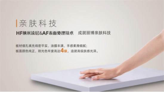丽博丽肤板之所以能成为两款新品的首选板材,并进入AWE展,主要在于板材融合了HF纳米准分子科技与业界领先的纳米涂层技术,从触感、视觉、质感及环保性等多维度,合力为人们打造具有亲和力的家居空间。