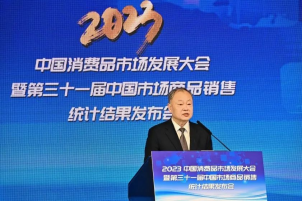 中国商业联合会会长姜明在会上致辞,他对中国经济和消费品市场状况做了简要阐述,肯定了商业和品牌生产企业为中国消费品市场发展做出的努力和贡献。2022年商业企业、品牌企业向善而为,逐光而行,不仅维持了自身的良好运营,更用实际行动诠释了社会责任担当。姜明同时指出,2023年是全面贯彻落实党的二十大精神的开局之年,是实施“十四五”规划承前启后的关键一年,希望广大商业企业和品牌企业,坚定信心,坚持高质量发展,既要盘活存量,更要创造增量,最终促进居民高品质消费与行业高质量发展同频共振。