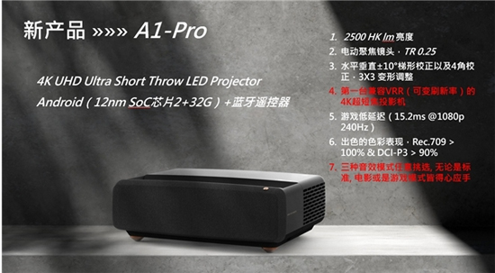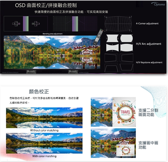 奥图码A1-Pro 4K超高清超短焦LED投影机是新品阵容的C位担当,这款投影对安装非常友好,支持TR 0.25电动聚焦镜,同时进行水平垂直±10°梯形校正以及4角校正,3X3变形调整,即使是复杂安装环境也能带来令人满意的投影效果。