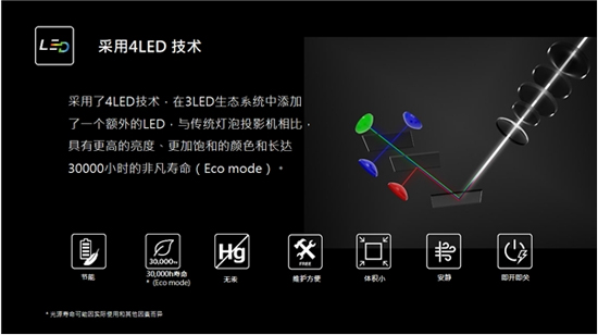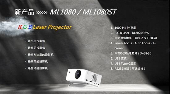 奥图码ML1080/ML1080ST激光投影机采用RGB三色激光光源,所有色彩皆为自然调和而成,搭配1000 HK lm亮度与98%BT2020色域,因此画面更符合人眼所见的鲜活画面,而强大的MT9669处理芯片能轻松播放4K片源,让用户尽情体验超高清影音的无限魅力。
