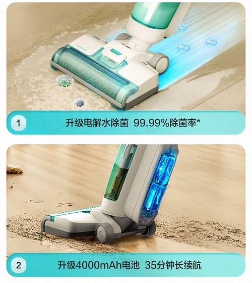 升级后的F10 Pro除菌版,则是在F10 Pro的基础上增加了电解水除菌功能,能够直接用自来水一键制备除菌液,不仅减少了耗材,洗地的同时就能实时除菌,除菌率高达99.99%*,在即将到来的夏天可以让家人放心躺平或光脚,呵护全家人健康。自清洁时,除菌功能对整机清洁也会更彻底。此外,它拥有4000mAh的高容量电池,续航时间延长至35分钟*,能轻松应对大户型的清洁需求。难能可贵的是,性能升级后,它的价格反而比F10 Pro更低,是多人口家庭或对清洁度要求更高的年轻人的首选。