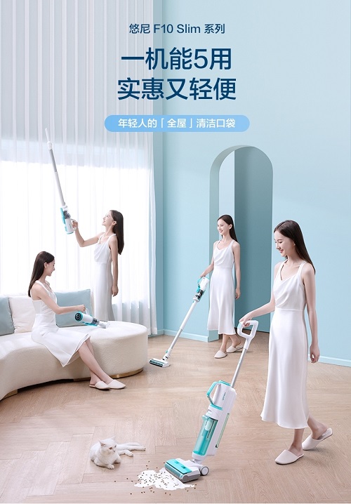 如果要问哪款产品的应用场景最多,那一定是能够1机5用的悠尼Slim。当作为洗地机时,喷、洗、吸、回收一气呵成,保证滚刷始终用活水洗地,避免地面二次污染;10000Pa的大吸力确保脏污快速被吸回污水箱中,越拖越干净;整机仅3.8kg,轻松拿取无压力;两面贴边清洁设计,让家中无清洁死角;自清洁时会模拟手洗抹布更干净,60秒常温离心风干对比普通热风烘干产品则能有效减少细菌二次污染的风险;20分钟的续航时间满足家庭的清洁需求。
