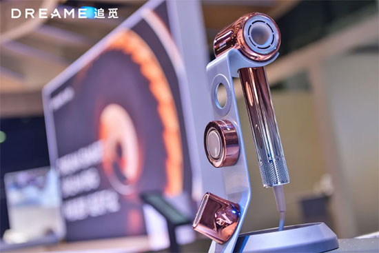 现场还展出了高速吹风机:追觅韶光、极光系列。依托追觅科技高速马达的核心技术,追觅韶光和极光高速吹风机拥有11万转/分钟高速马达,40秒可吹干短发,2分钟吹干及肩发,4分钟吹干中长发。不仅如此,追觅科技还进一步拓展了吹风机护发的新形态:追觅韶光护发高速吹风机所搭载的追觅科技护发精华弹和3亿超高浓度负离子带来优质护发体验。