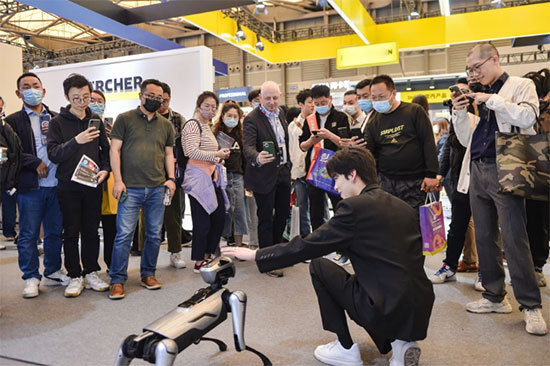 得益于搭载了12组高性能伺服电机、21TOPS澎湃算力及多种传感器,Eame One二代可完成爬坡、上楼梯、跨越障碍、跳舞等高难度动作,并且能精准判断多种地形,适应复杂环境。仿生四足机器狗Eame One二代精彩互动引来现场诸多现场观众打卡围观。