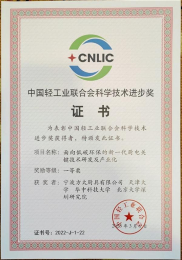 方太再次斩获中国轻工业联合会科技进步一等奖