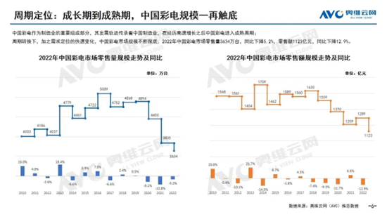 过去的2022年,中国电视市场持续承压,整体进入下行通道。奥维云网公布的2022年度中国彩电市场年度报告显示,2022年中国彩电市场零售量规模为3634万台,同比下降5.2%,零售额规模为1123亿元,同比下降12.9%。电视换新需求放缓,市场消费意愿降低,外加产品创新力不足,电视“内卷化”不断加剧,企业间拼尺寸、拼性能、拼价格,导致电视产品同质化严重,市场销量持续低迷,整体行业陷入发展瓶颈。