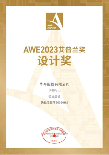 4月29日,2023年度AWE艾普兰奖获正式揭晓,凭借出众的美学设计和硬核品质,华帝快拢吸超薄烟机E6090HS于激烈角逐中脱颖而出,荣获“AWE2023艾普兰奖设计奖”。