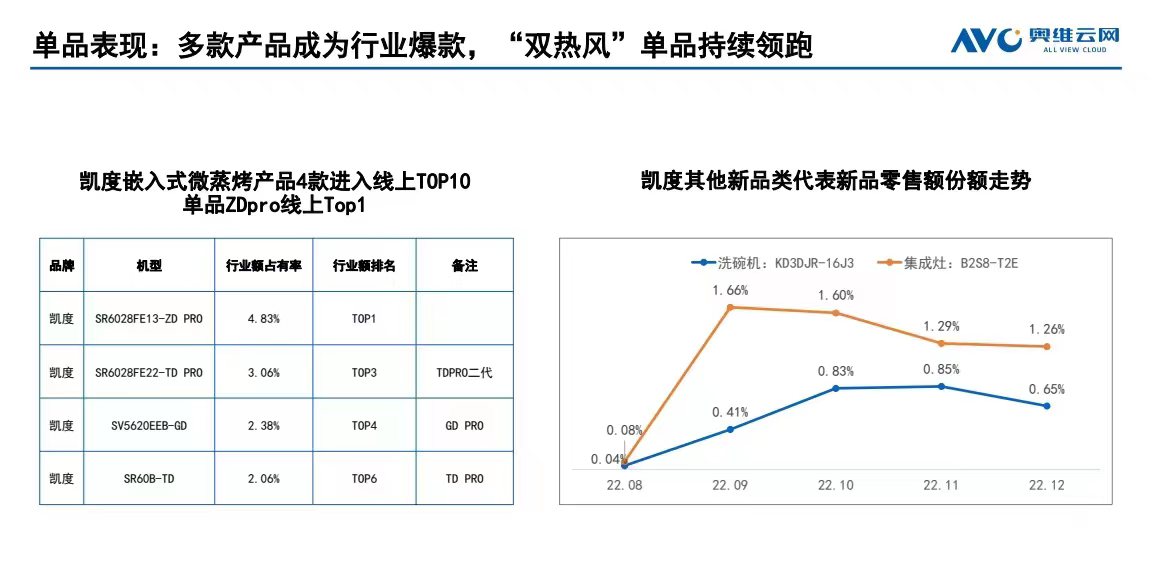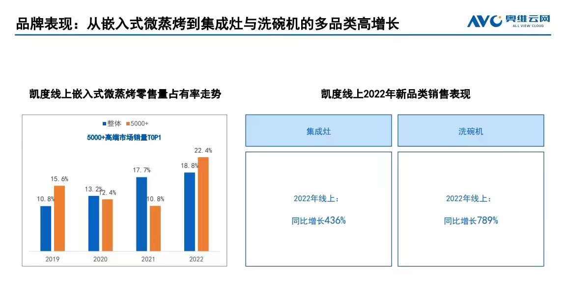 而这样的创新方式和产品赋能也获得了消费者的认可。来自奥维云网的数据显示,2022年线上市场,凯度集成灶和洗碗机同比分别增长了436%和789%。嵌入式微蒸烤产品中有4款进入线上TOP10,SR6028FE13-ZDPRO嵌入式微蒸烤品类线上销额TOP1,5000元以上嵌入式市场中,凯度销量第一。