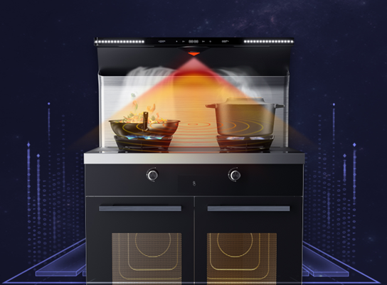 在吸烟性上,这台集成灶表现很优秀,它的机身顶部和背板呈120°折弯广角,加速烟气