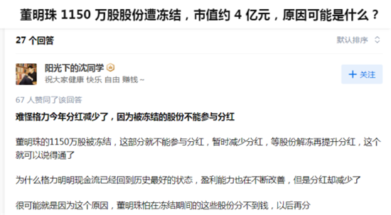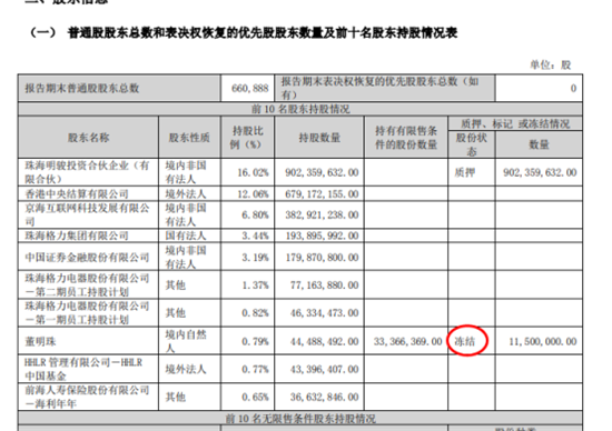 按照5月4日收盘的每股35.42元计算,董明珠遭冻结的股份市值高达4.07亿元。