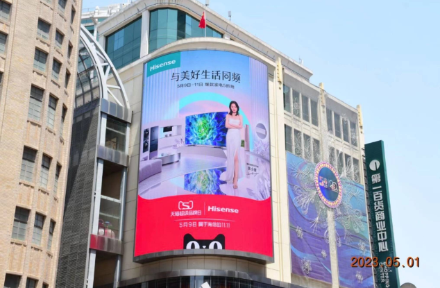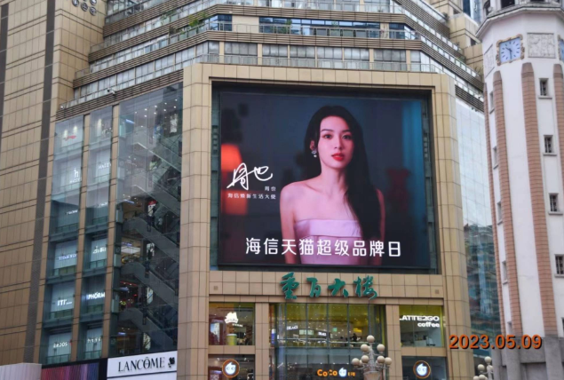 上海第一百货、成都太古里、重庆解放碑、杭州武林银泰、南京新街口等热门地标大屏均被海信品质生活大使张小斐和海信天猫超级品牌日的明星产品们占据了视觉中心。海信用最简单直接的方式,预告了5月9日上线的海信天猫超级品牌日。进一步拉近与用户的距离,除线上话题及互动外,增加了与用户沟通的触点,达成与更多受众的深度链接。