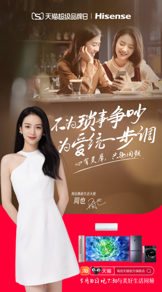 为了同新世代消费人群深入沟通,这次海信为天猫超级品牌日史诗级匹配了三个明星作为同频观察员。海信品质生活大使张小斐,以及海信焕新生活大使周也、知名篮球解说杨毅同时加盟,传达与美好生活同频的主张。通过诠释演绎亲情、爱情、友情中遇到的不同频问题,引发人们的思考与共鸣。放大海信的产品角色,在家电的助力下实现同频的美好生活。这些不同亲密关系的情感演绎,将活动理念和海信产品特点传递给更多人,号召大众一起来探寻与美好生活同频的秘密。