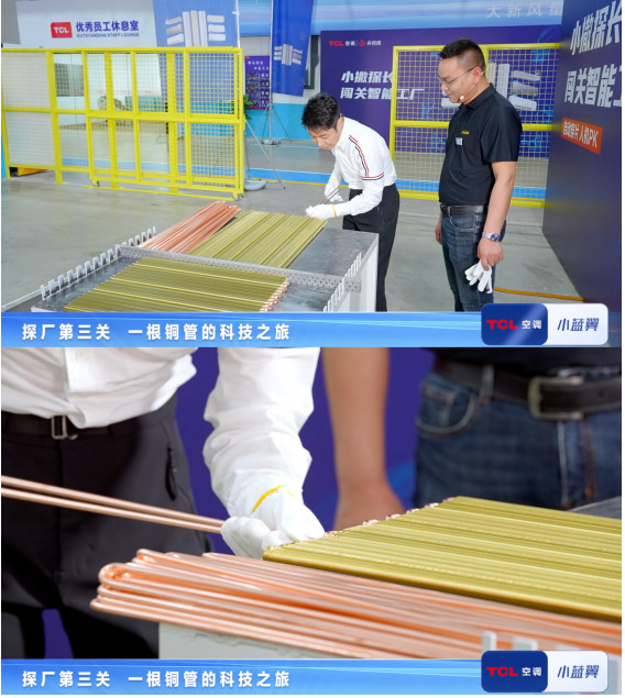 在AGV小车的指引下,小撒“探长”来到生产空调核心部件的两器车间,开启了“一根铜管的科技之旅”。在这里,一根根铜管都在经过切割、穿片、焊接等工序后,被加工成一个个空调的核心零部件。在自动穿片工序,小撒“探长”竟忍不住单挑自动化机器,但毫无意外这场“人机大战”还是以机器人的胜利告终。