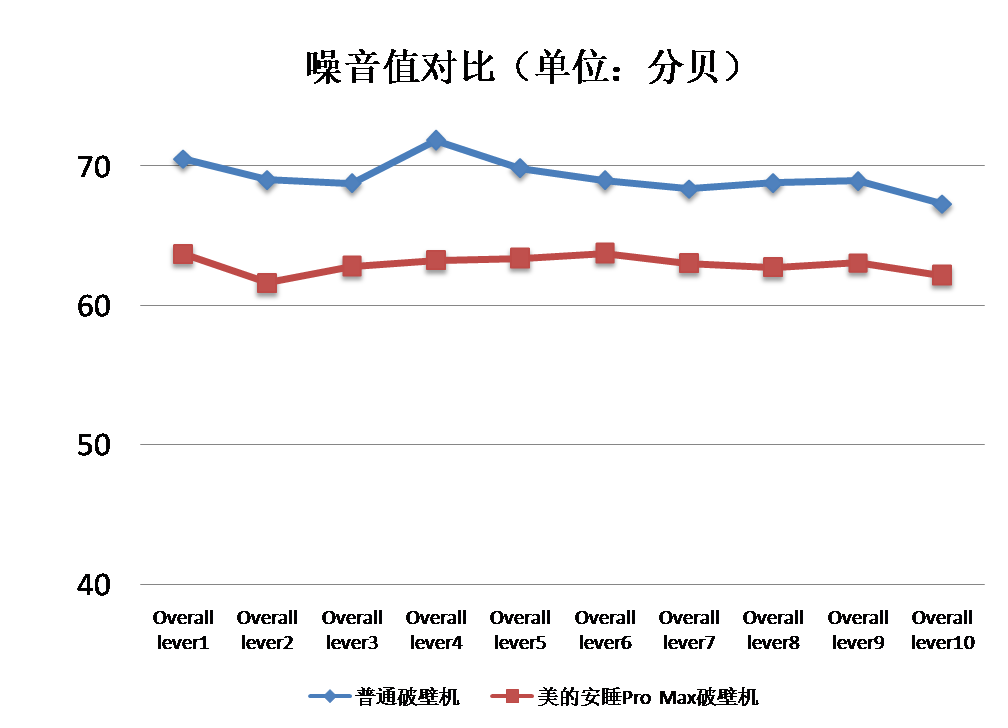 实测显示,选择“豆浆”模式时,普通的破壁机平均噪音值超过69分贝,而美的人感科技•轻静感安睡Pro Max破壁机工作噪音最低43分贝,最高仅62分贝,远低于普通破壁机。