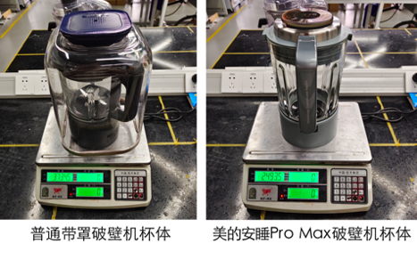 经过实测,普通带罩破壁机的杯体,重量为3734.5g。美的人感科技•轻静感安睡Pro Max破壁机的杯体,只有2493.5g,比普通带罩破壁机的杯体轻了33%。