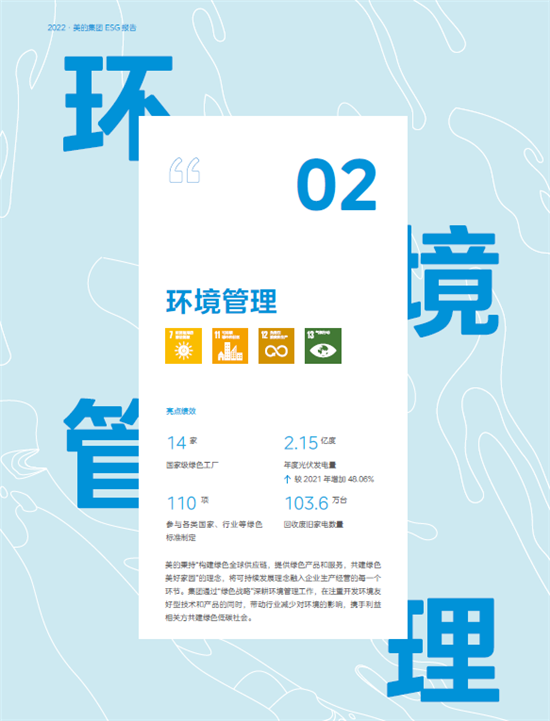 2023年4月,美的集团正式发布2022年度ESG报告,这也是美的集团发布的第二份ESG报告。报告的编写参考了联合国可持续发展目标(Sustainable Development Goals)的17个新发展目标,即可持续发展目标旨在从2015年到2030年间以综合方式彻底解决社会、经济和环境三个维度的发展问题,转向可持续发展道路。17个可持续发展目标也是目前企业普遍使用的、作为ESG报告的重要指导工具。